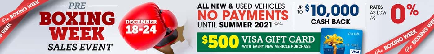 Pre-Boxing Week sales event offering no payments until summer, $500 Visa gift card, up to $10,000 cash back.